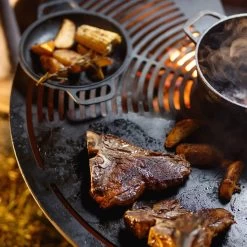 Avec le brasero multifonctionnel AHOS 850, il est possible de préparer divers plats sur le brasero. Vous pouvez désormais cuisiner du vin chaud ou du pilaf, cuire des steaks et des légumes grillés, ou même faire frire des crêpes et des œufs sur le brasero. La Uniek de cet article est que vous pouvez cuisiner différents plats en même temps. La bouillie, les écrevisses ou le vin chaud peuvent être cuits au centre dans un chaudron, qui est installé sur un anneau spécialement conçu. Les autres morceaux de viande, d’œufs ou de crêpes peuvent être frits sur le gril à côté. En raison des différences de chaleur sur l’anneau du gril, il est préférable de cuire le steak vers le centre de l’anneau, par exemple, et les légumes plus à l’extérieur de l’anneau.