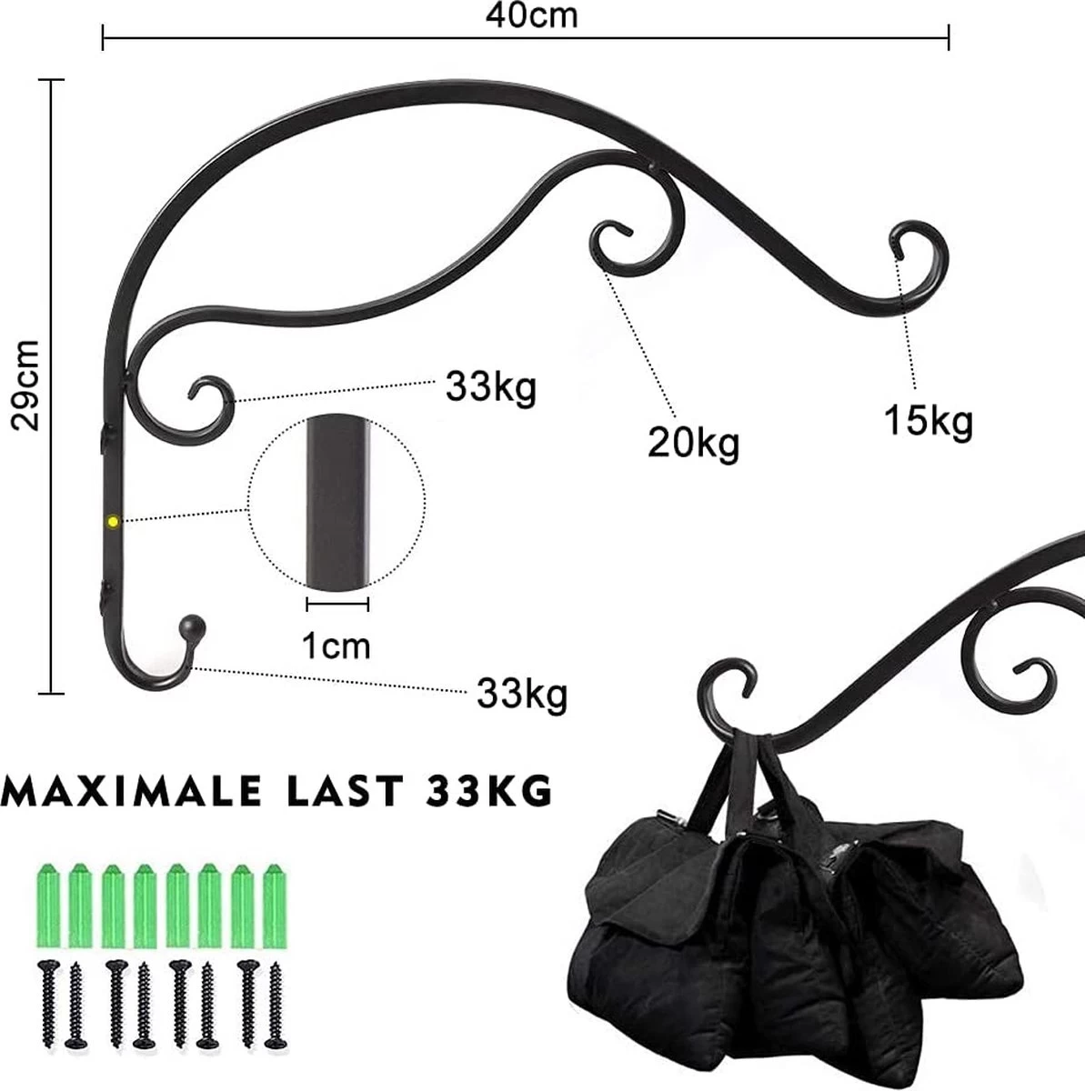 - Super porter. Forme simple et processus de soudage à haute résistance pour porter la capacité de charge à un minimum de 15 kg/crochet. Capacité de charge maximale: 30 kg. Il y a quatre crochets avec différentes capacités de chargement, détails comme sur l’image. Dimensions : 40 cm (L) x 1,2 cm (l) x 29 cm (H), 2 pièces dans un pack.