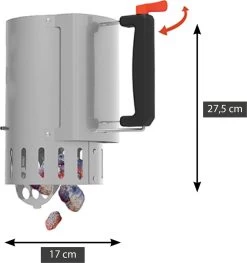 Grâce au système Safe Drop unique de Barbecook , il n’est plus nécessaire de tourner votre démarreur de barbecue. Lorsque les charbons sont prêts à être utilisés, appuyez sur le bouton rouge et la vanne au bas du démarreur à charbon s’ouvrira d’elle-même. Ensuite, vous soulevez doucement le démarreur de briquette pour que les charbons ardents atterrissent tranquillement sur la grille. Exactement là où vous le souhaitez et sans risque d’incendie ou de brûlure!