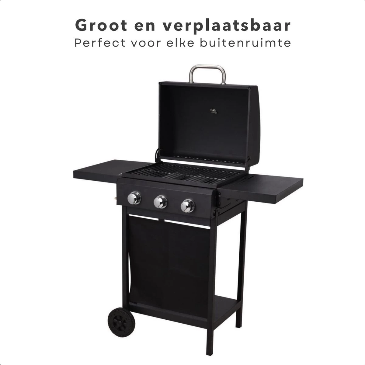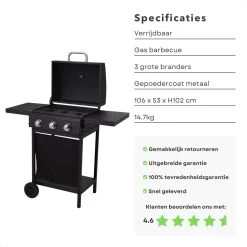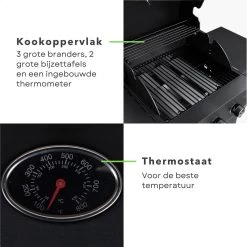 Le barbecue à gaz est un barbecue puissant et polyvalent avec 3 brûleurs. Cet ensemble de barbecue en métal enduit de poudre a une taille totale de 106 x 53 x H102 cm, ce qui le rend facile à déplacer. Avec les 2 tables d’appoint de chaque côté, vous disposez de suffisamment d’espace pour ranger tous vos ingrédients pendant la cuisson. Le thermomètre dans le couvercle vous permet de savoir exactement quand vos aliments sont cuits. Avec une puissance de 2,8 kW par brûleur, vous pouvez rapidement atteindre des températures élevées.