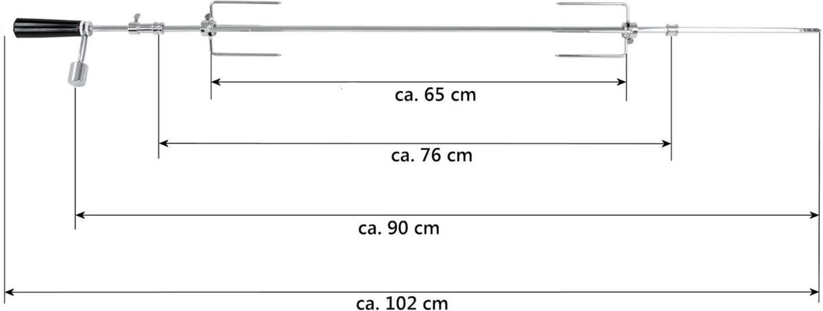La Spit elle-même ne mesure pas moins de 90 cm de long. Les fourchettes à Spit et à viande sont en acier inoxydable (qualité 304). Certains concurrents utilisent de l’acier chromé, mais c’est moins sûr car des particules de chrome peuvent se retrouver dans les aliments.