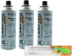 3x remplissage de gaz de bouteille de gaz butane, 227 grammes avec briquet à gaz. Bidon de gaz butane pour cuisinières de camping et désherbage. Contenu: 3x 227 grammes. composé de 1x briquet barbecue 25 cm, 3x bouteille de gaz butane remplissage de gaz 227 grammes