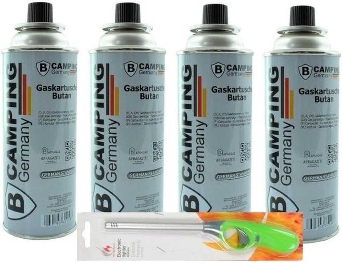 4x bouteille de gaz butane remplissage de gaz, 227 grammes avec briquet à gaz. Bidon de gaz butane pour cuisinières de camping et désherbage. Contenu: 4x 227 grammes. composé de 1x briquet barbecue 25 cm, 4x bouteille de gaz butane remplissage de gaz 227 grammes
