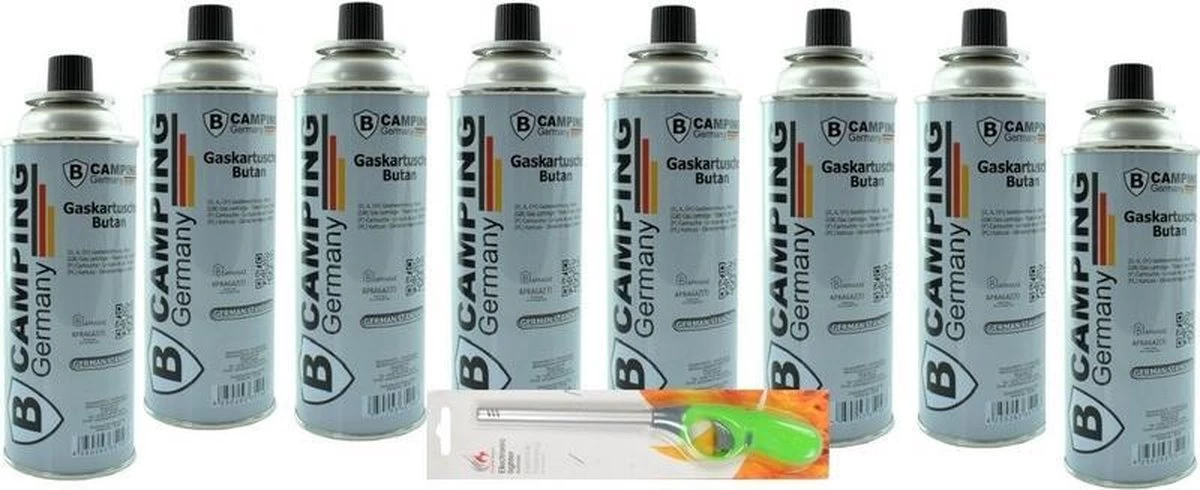 8x remplissage de gaz de bouteille de gaz butane, 227 grammes avec briquet à gaz. Bidon de gaz butane pour cuisinières de camping et désherbage. Contenu: 8x 227 grammes. composé de 1x briquet barbecue 25 cm, 8x bouteille de gaz butane remplissage de gaz 227 grammes