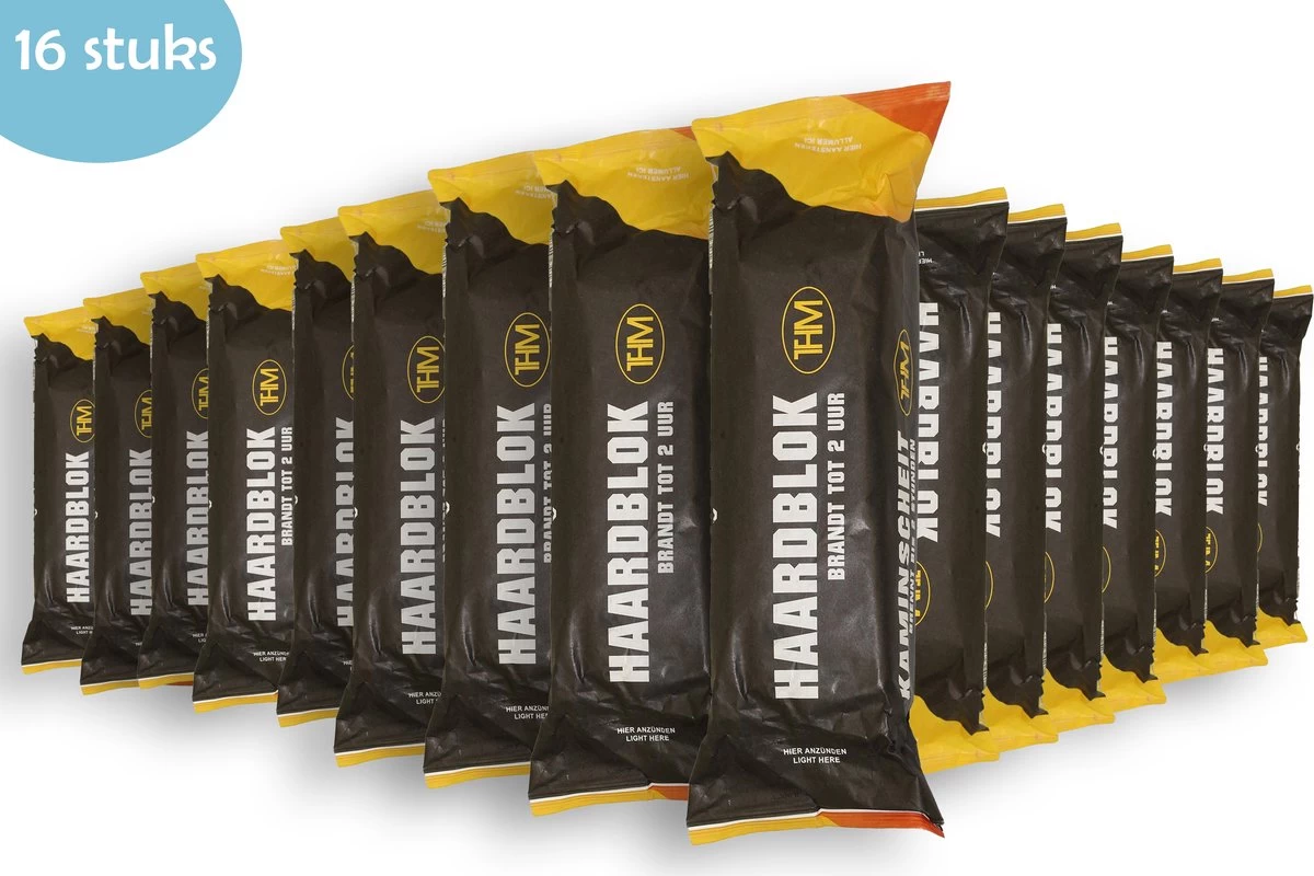 pare-feu 16 pièces. Idéal pour une cheminée et un foyer. Brûle plus longtemps et mieux que le bois normal. Facile à allumer: allumez les 2 extrémités et le foyer s’allumera automatiquement. La bûche a une durée de combustion de 2 à 3 heures.