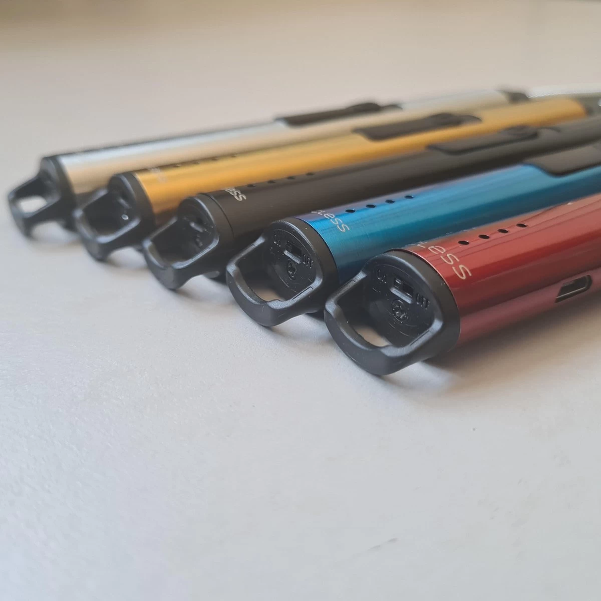Le briquet Cless est rechargeable et entièrement chargé en 1,5 heure avec le câble USB inclus. Le briquet est équipé de 4 indications LED qui indiquent le niveau de la batterie. Lorsque les quatre sont allumés, il est complètement chargé. Trois lumières (75%), deux lumières (50 %), une lumière (25 %), pas de lumière (pile vide).