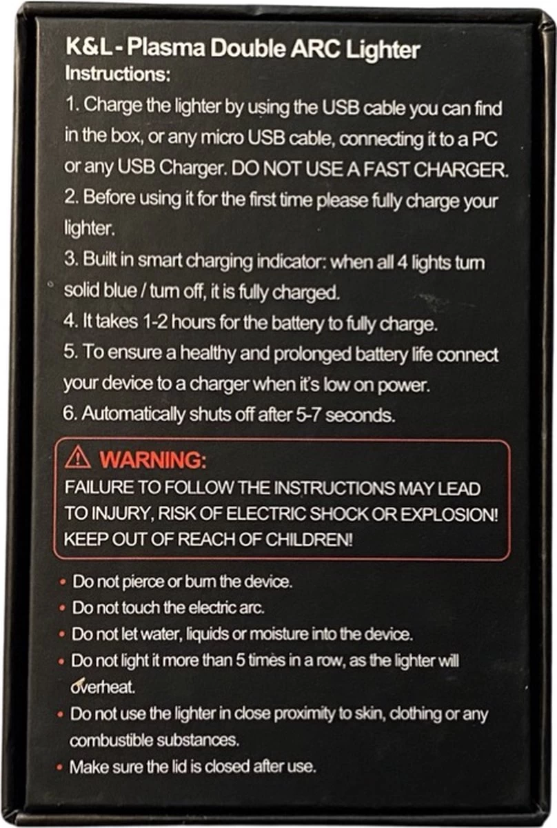 Ce briquet plasma est rechargeable et peut être utilisé jusqu’à 300 allumages par charge. Chargez-le avec le câble USB inclus et il sera à nouveau prêt à être utilisé en seulement 30 minutes.