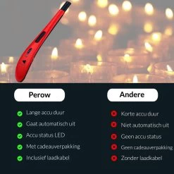 Avec ce briquet à plasma Perow, vous pouvez facilement créer vos bougies, cuisinière, barbecue et autres. Le briquet à plasma est un briquet électrique et fonctionne sans feu, il fonctionne donc dans toutes les conditions météorologiques. Le briquet n’utilise pas de gaz, ce qui le rend également très durable. Le briquet est équipé d’une protection contre l’allumage, ce qui rend difficile pour les enfants de l’enfiler. Le briquet électrique est livré dans un bel emballage, idéal pour offrir ce cadeau à quelqu’un d’autre ou à vous-même!