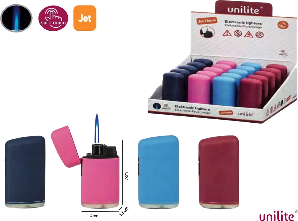 Briquets Jet Flame Unilite – briquet turbo – 20 pièces en présentoir – 4 ass. couleur soft – briquets soft au toucher