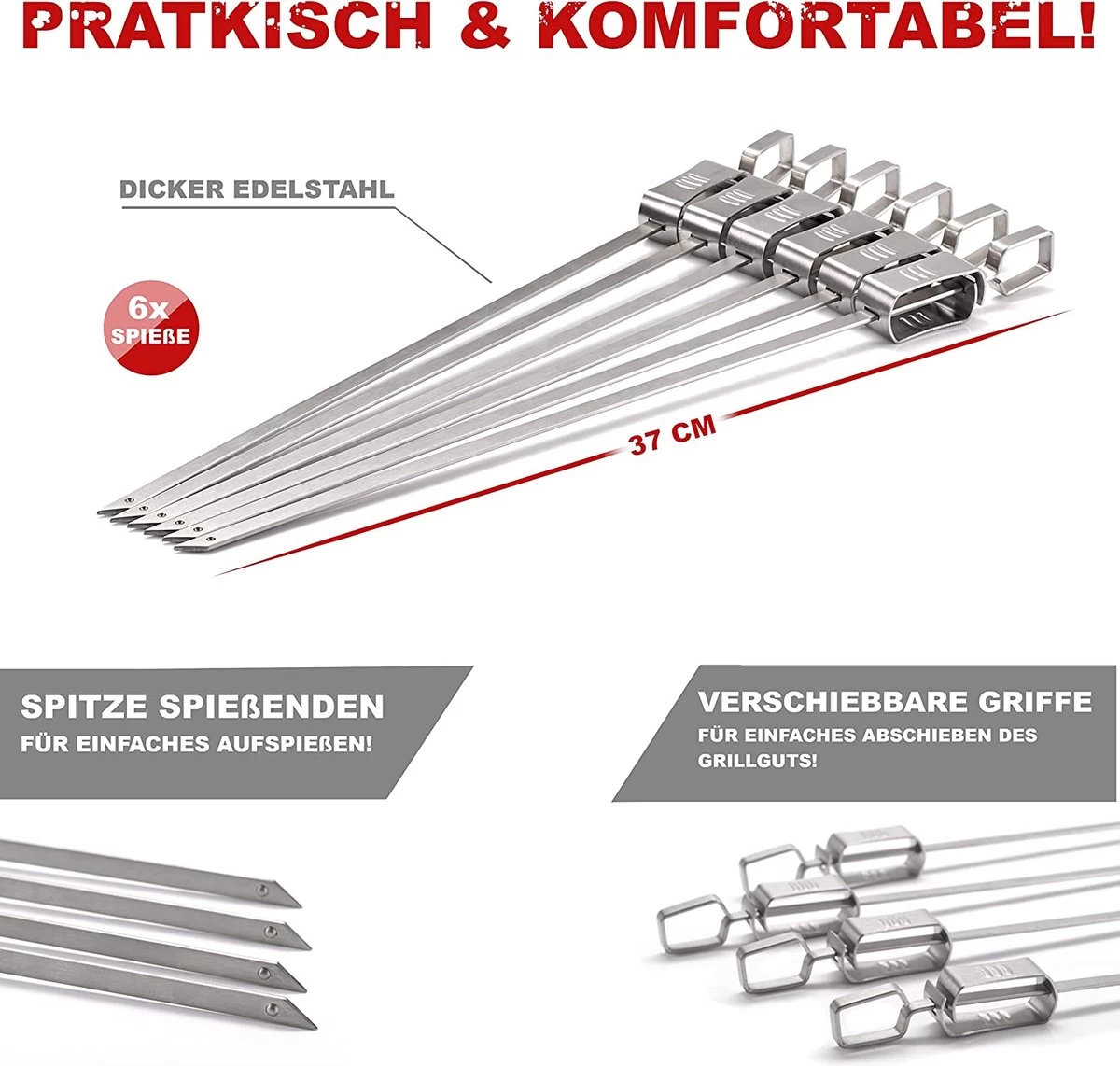 - Pour tous les barbecues : en brochette chachlik sur gril gaz, en brochette gril sur gril charbon ou en brochette inox sur gril électrique. Cet ensemble de brochettes de gril est conçu pour fumer dans le gril et avec cela, vous obtenez les meilleurs résultats partout. Dimensions des 6 brochettes : 37 x 0 x 0 cm