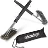 Ensemble de 2 brosses à barbecue. Au bout de la brosse se trouve un grattoir qui peut être utilisé pour enlever la saleté collée. En plus de la brosse et du grattoir, il y a aussi un tampon à récurer pour enlever la saleté.