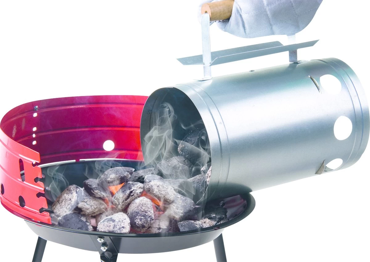 Remplir le démarreur de charbon de bois Un démarreur à briquettes fonctionne comme ceci : placez-le au centre du barbecue. Remplissez d’abord le démarreur du BBQ avec une couche d’allume-feu, de papier ou de bois d’allumage. Complétez ensuite avec du charbon de bois ou des briquettes. Allumez le démarreur par le bas par les trous d’aération. Le feu tire maintenant facilement dans les charbons car le démarreur forme un tube métallique rond scellé avec des trous d’oxygène au fond. Lorsque les braises brillent, vous pouvez les verser délicatement du démarreur de barbecue dans le barbecue.