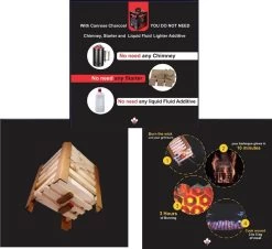 Le charbon de bois pressé Canrose est livré dans des boîtes spéciales pour un allumage facile du charbon de bois. Ces charbons de BBQ ne nécessitent pas de démarreur car la boîte elle-même peut être utilisée comme démarreur. Les braises ont une durée de combustion de 3 heures.