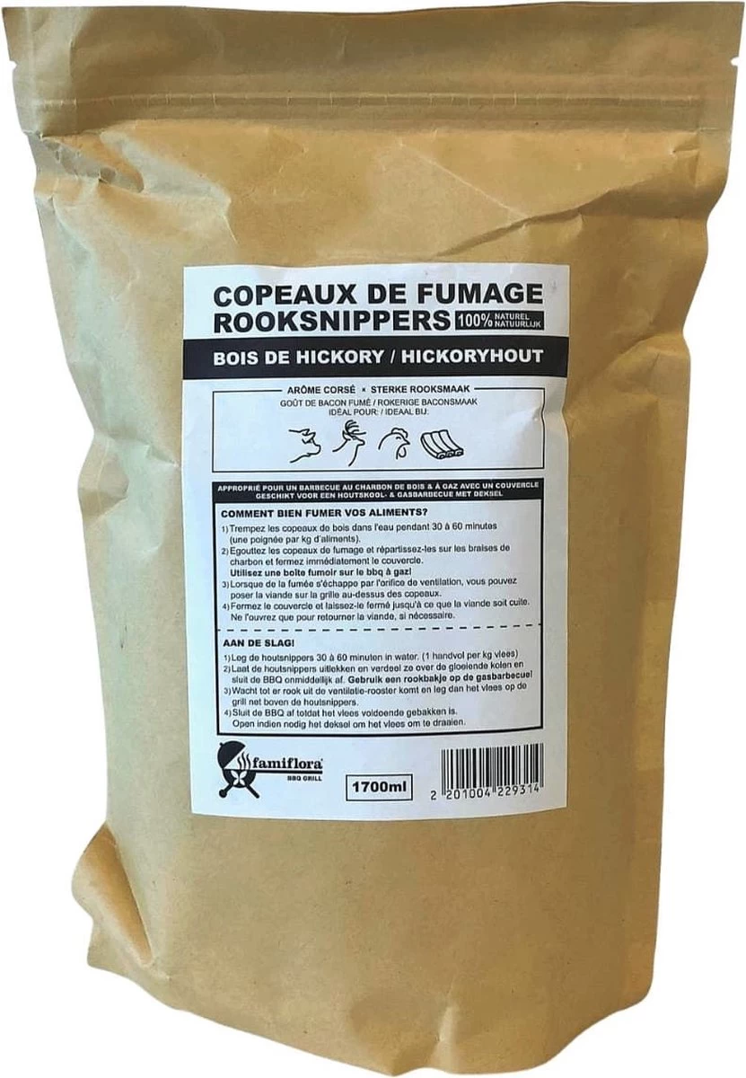 Placez ces copeaux de bois dans l’eau pendant 30 à 60 minutes avant de les utiliser (1 poignée par kg de viande).