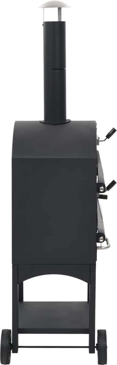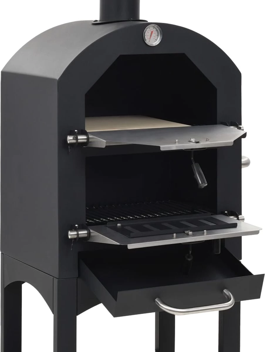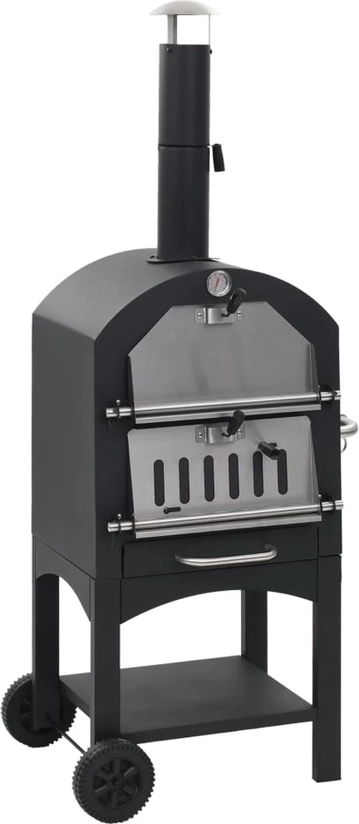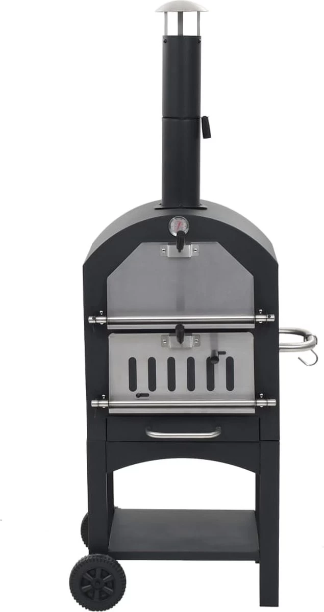 Ce four est fabriqué en acier peint par poudrage de haute qualité et est extrêmement robuste et durable. La plaque de cuisson est amovible pour un nettoyage rapide et facile. L’étagère pratique en bas offre de l’espace pour ranger des gants de cuisine ou d’autres accessoires. Ce four dispose également d’un thermomètre intégré qui indique la température de cuisson. Le fumeur est facile à déplacer grâce aux deux roues. Une pierre à pizza est incluse dans la livraison.