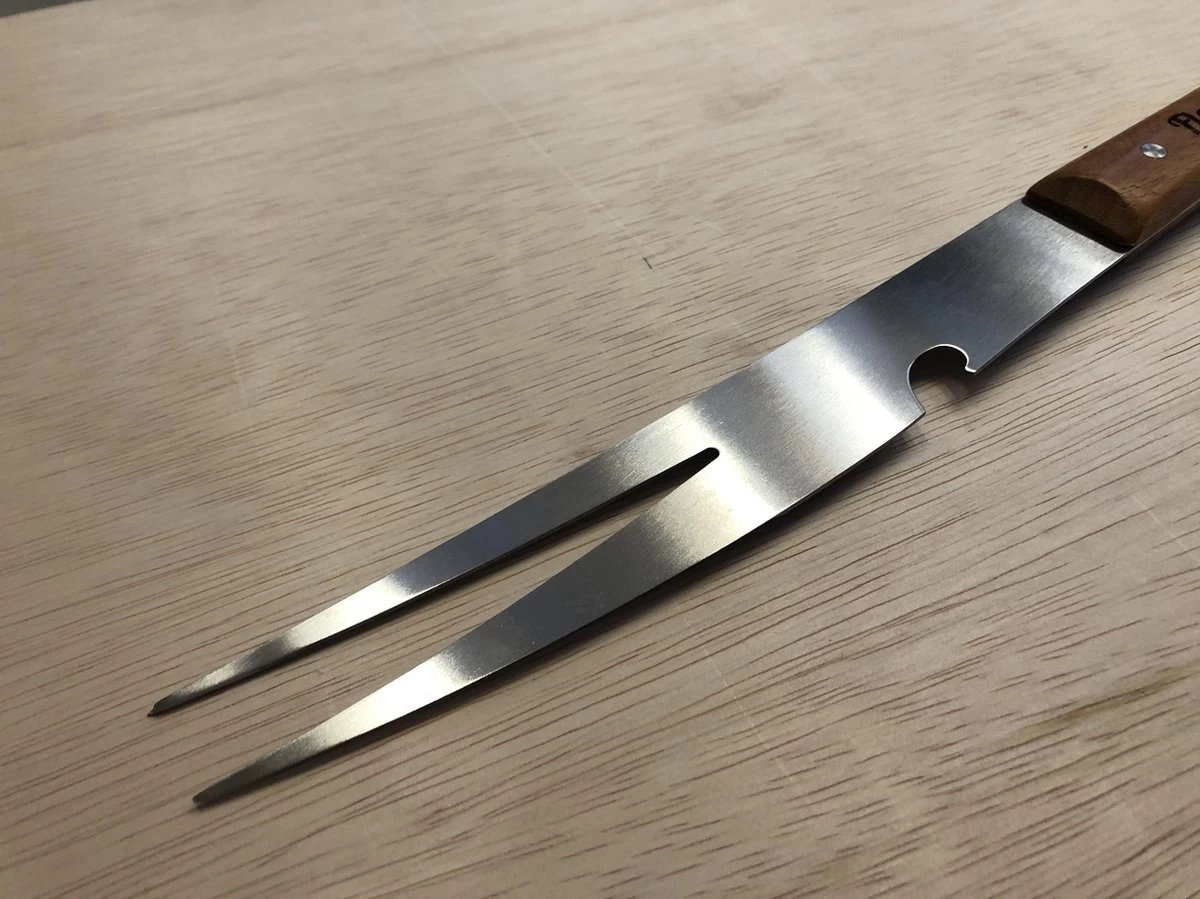 L’outil a une fourchette pour servir ou retourner les aliments, un couteau pour couper les aliments et un décapsuleur.