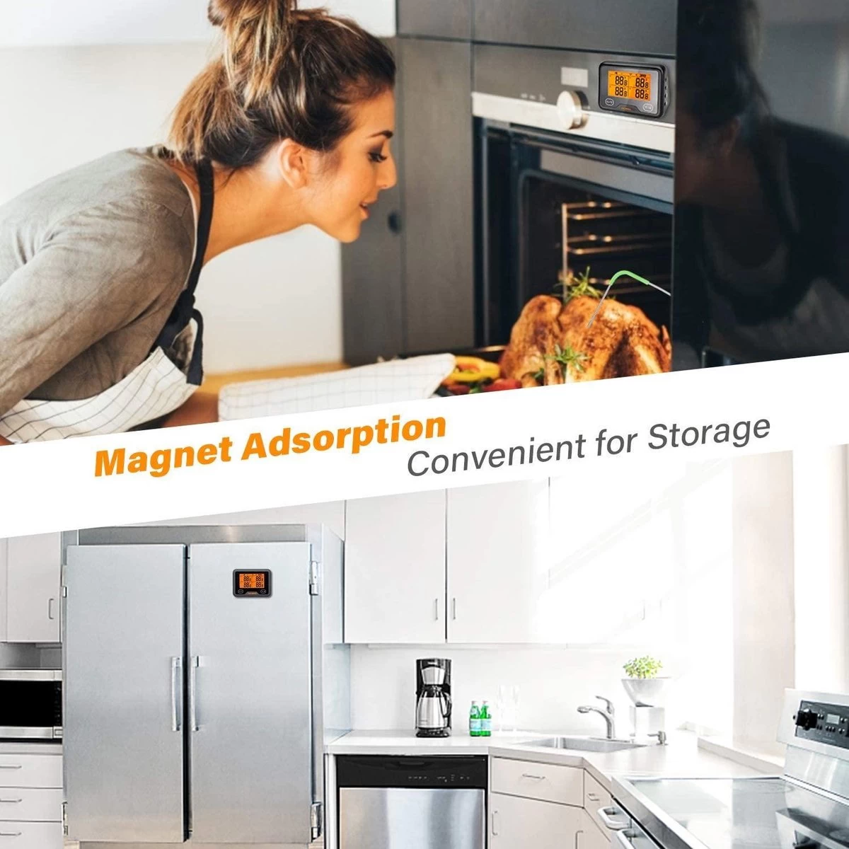 La conception magnĂ©tique permet au thermomètre d’ĂŞtre fixĂ© sur des surfaces d’appareils Ă©lectromĂ©nagers tels que des fours, des rĂ©frigĂ©rateurs ou d’autres surfaces mĂ©talliques, ce qui est pratique pour le stockage.