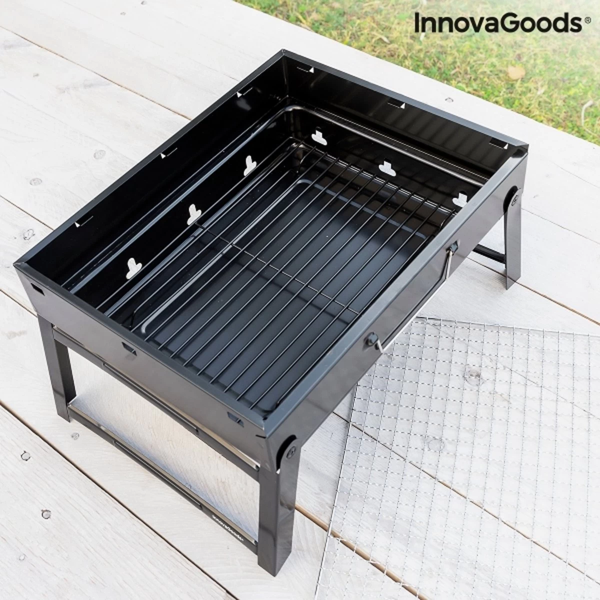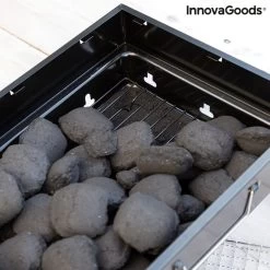 Il a des trous de ventilation et une poignée de transport pour un transport facile. La grille alimentaire amovible vous permet d’ajouter facilement du charbon de bois à tout moment. De plus, il comprend une grille inférieure de protection qui est placée à l’intérieur, à la base du barbecue, pour y placer du charbon de bois (max. 1,5 kg).