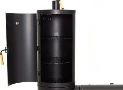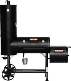Fumoir barbecue déporté extrêmement robuste. Le foyer et la chambre de combustion sont séparés, de sorte que la fumée est dirigée vers le gril/chambre de fumée. Les grilles de cuisson robustes sont en fil d’acier émaillé de 6 mm d’épaisseur.