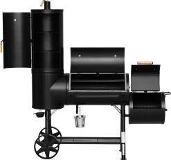 Fumoir barbecue déporté extrêmement robuste. Le foyer et la chambre de combustion sont séparés, de sorte que la fumée est dirigée vers le gril/chambre de fumée. Les grilles de cuisson robustes sont en fil d’acier émaillé de 6 mm d’épaisseur.