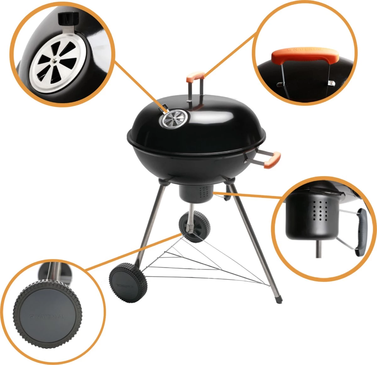 - PRATIQUE : Ce BBQ a une étagère sous le BBQ où vous pouvez ranger le sac de charbon de bois et l’avoir toujours à portée de main. Grâce aux deux roues et à la poignée, il est facile à ranger et à déplacer. La poêle à BBQ est équipée d’un collecteur de cendres, vous pouvez donc nettoyer la grille du gril plus rapidement.