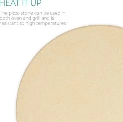 - DANS LA BOÎTE : Vous recevrez une plaque à pizza d’un diamètre de 35 cm et d’une épaisseur de 1,5 cm, qui peut résister à des températures jusqu’à 800°C.