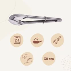 Ces pinces de cuisine Orange85 sont un outil pratique dans la cuisine. Les pinces peuvent être utilisées, par exemple, pour ramasser ou servir de la nourriture. La pince a une longueur de 30 cm. La pince est livrée avec un clip avec lequel vous pouvez ranger la pince fermée. Les pinces sont en acier inoxydable. Cela rend les pinces adaptées au lave-vaisselle.