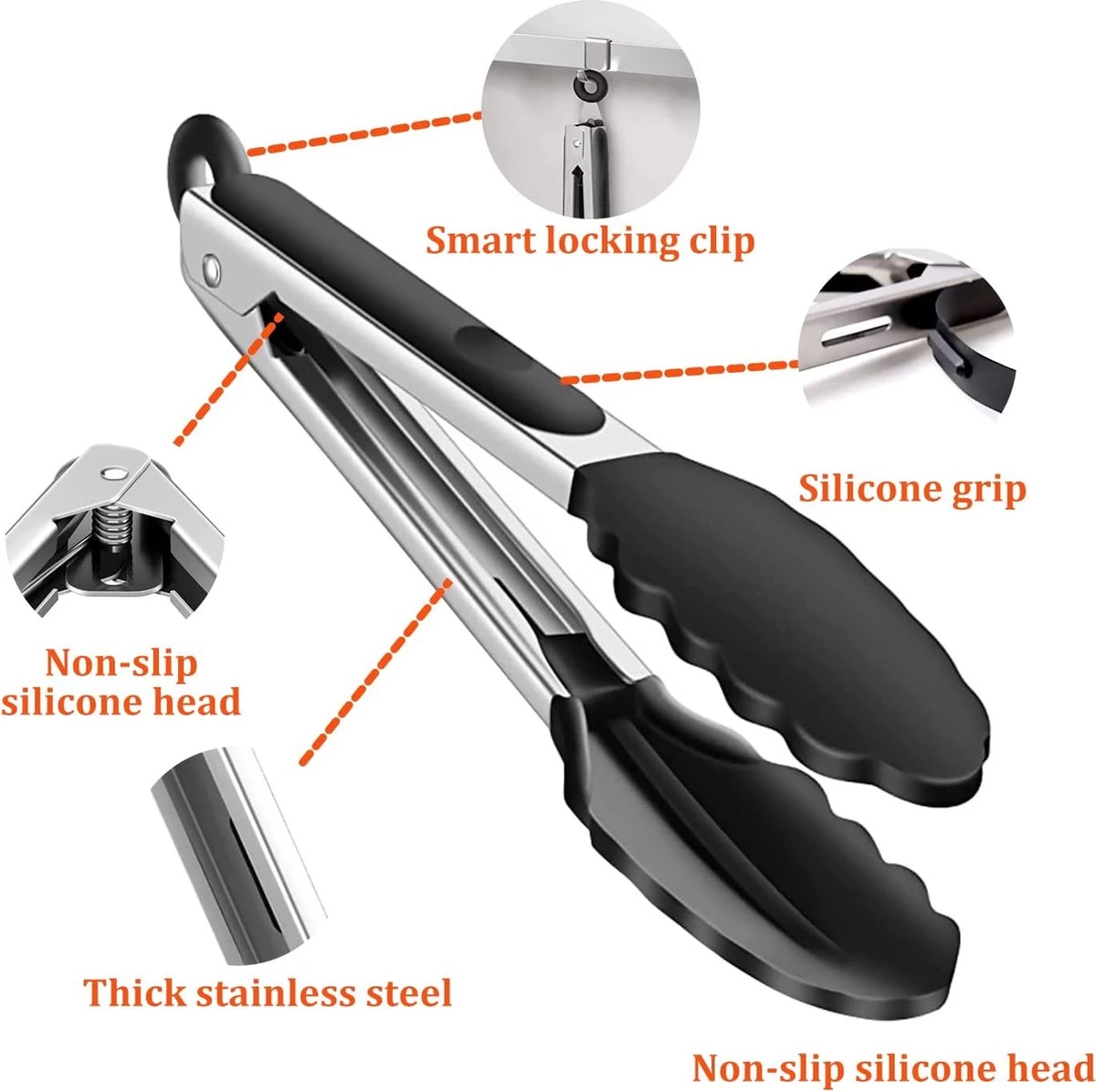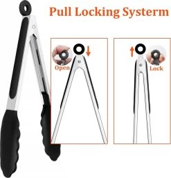 - CLIP DE VERROUILLAGE STOCKABLE】 La conception avec un clip de verrouillage intelligent et une technologie d’anneau de traction garantit que vos pinces ne peuvent pas être ouvertes et fermées accidentellement, vous offrant un meilleur contrôle pendant l’utilisation. Vous pouvez verrouiller et accrocher votre cuisine après utilisation.