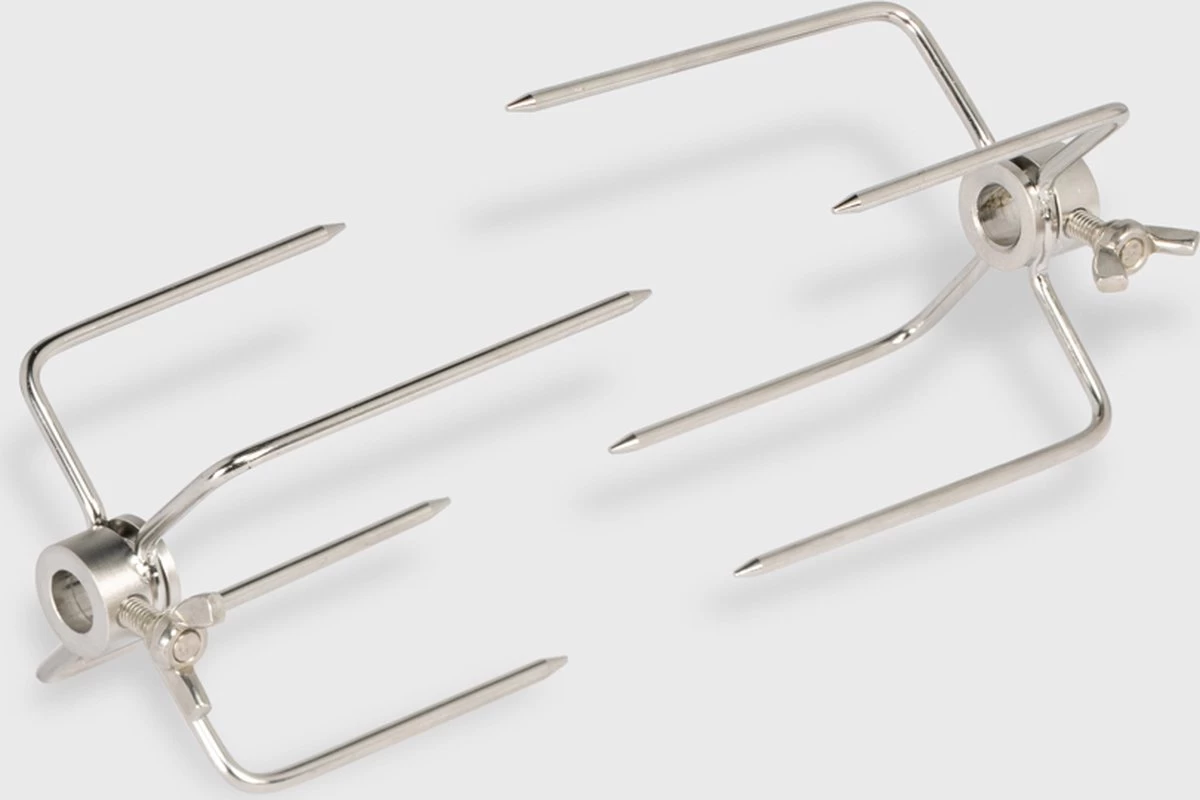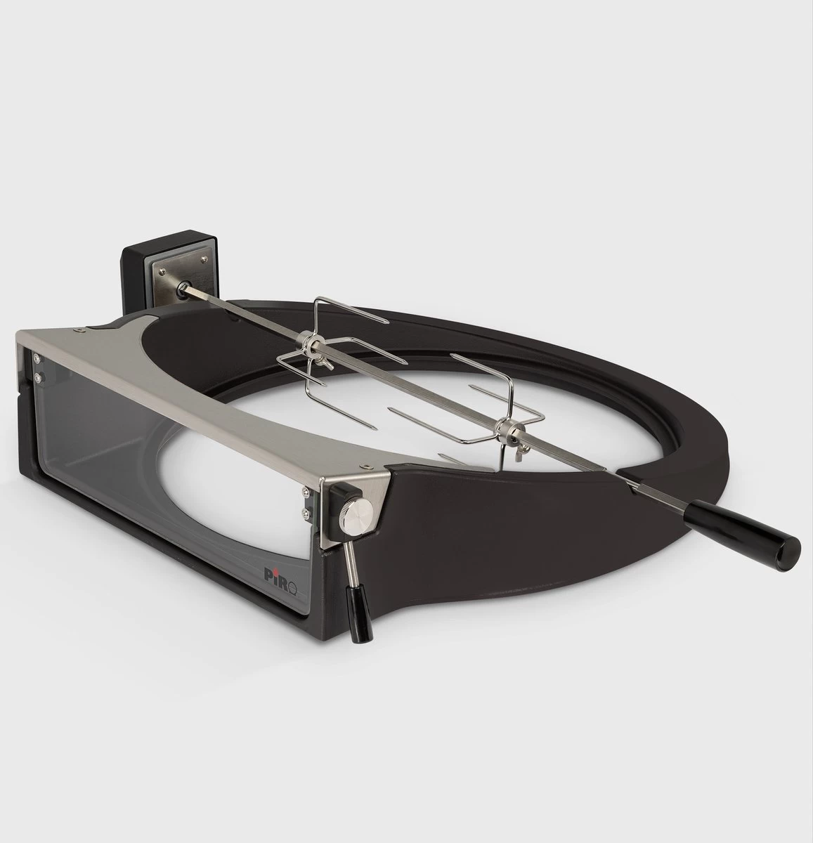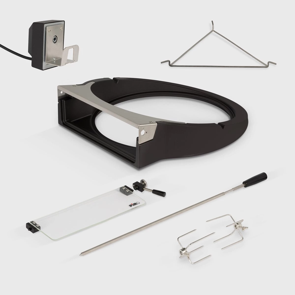 Le PiRO est livré complet avec la broche de rôtisserie comprenant le moteur de broche, deux fourchettes de broche, le support triangulaire et les instructions de sécurité et d’utilisation.