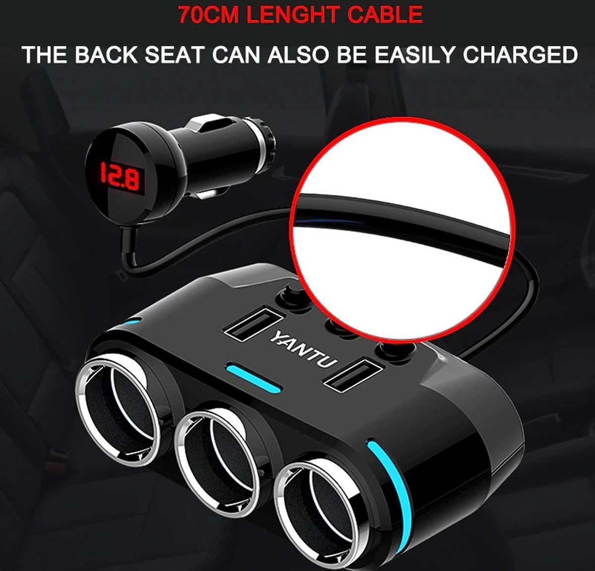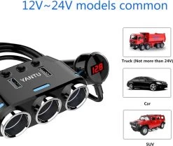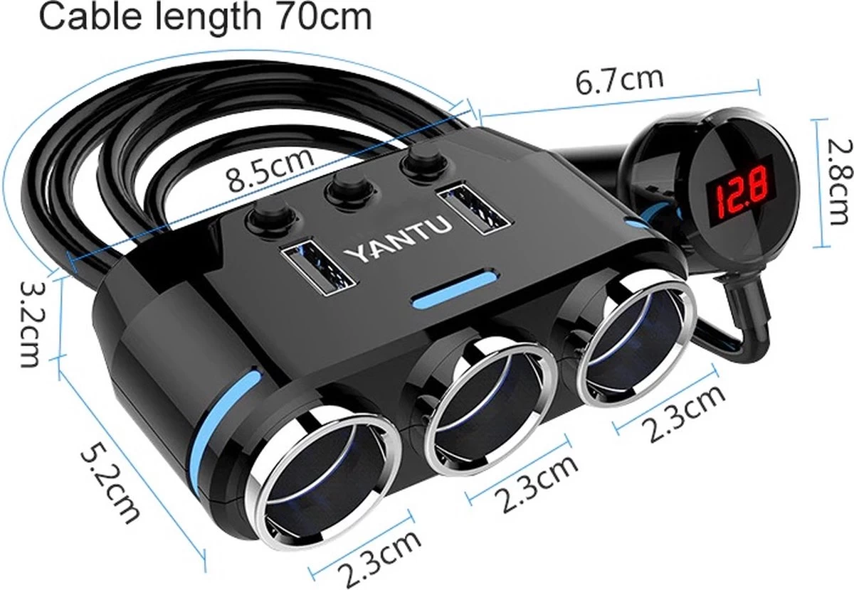 Répartiteur allume-cigare pour voiture Yantu avec éclairage LED 12V/24V – 3x entrée allume-cigare – 2x USB – Avec voltmètre.