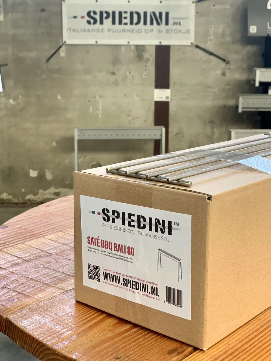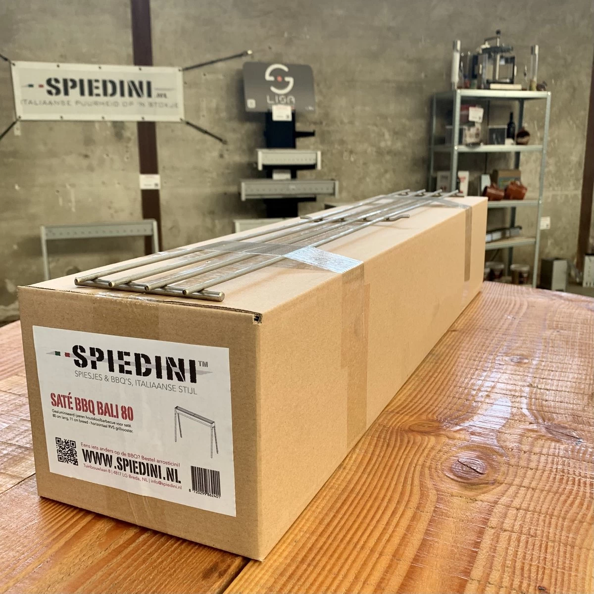 La longueur de ce BBQ est de 78,5 centimètres, la largeur du plateau du gril est de 11 centimètres et il a une hauteur de travail de 79,5 cm. Avec des pieds très solides. Ce BBQ saté est conçu et fabriqué avec amour dans la capitale des Abruzzes, Pescara. Spiedini est le distributeur exclusif de ce produit aux Pays-Bas ! Et maintenant, nous avons notre eigen modèle, avec une grille horizontale, spécialement pour le marché néerlandais – pour le satay.