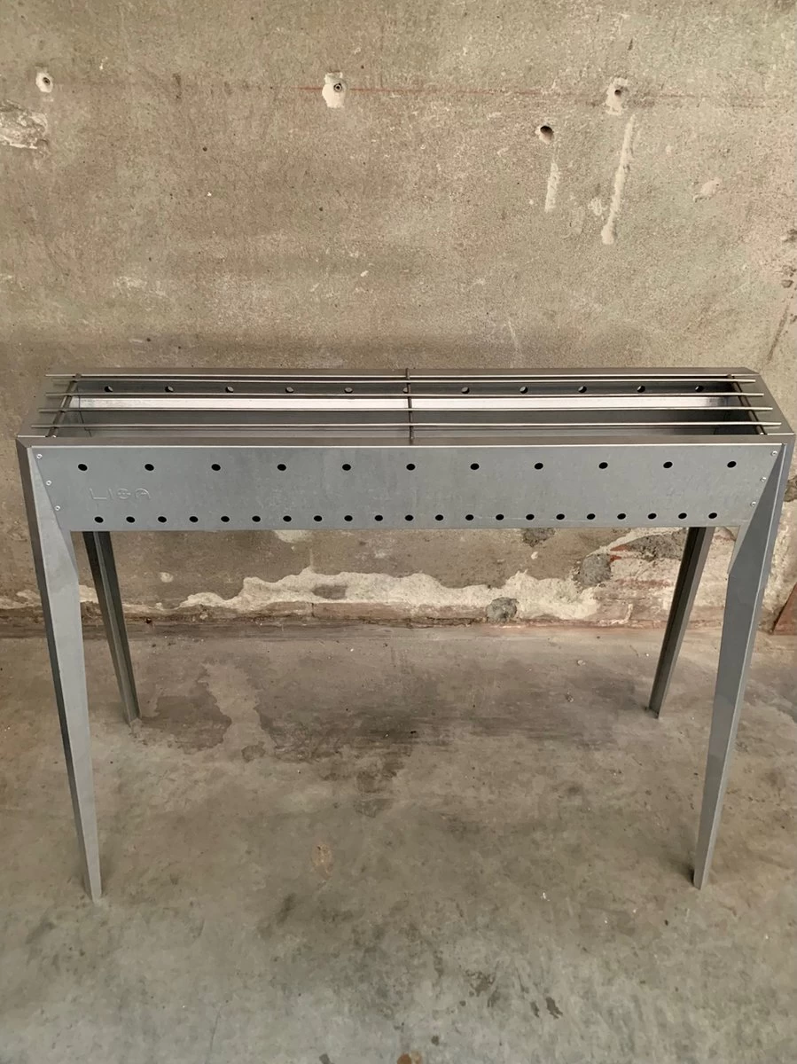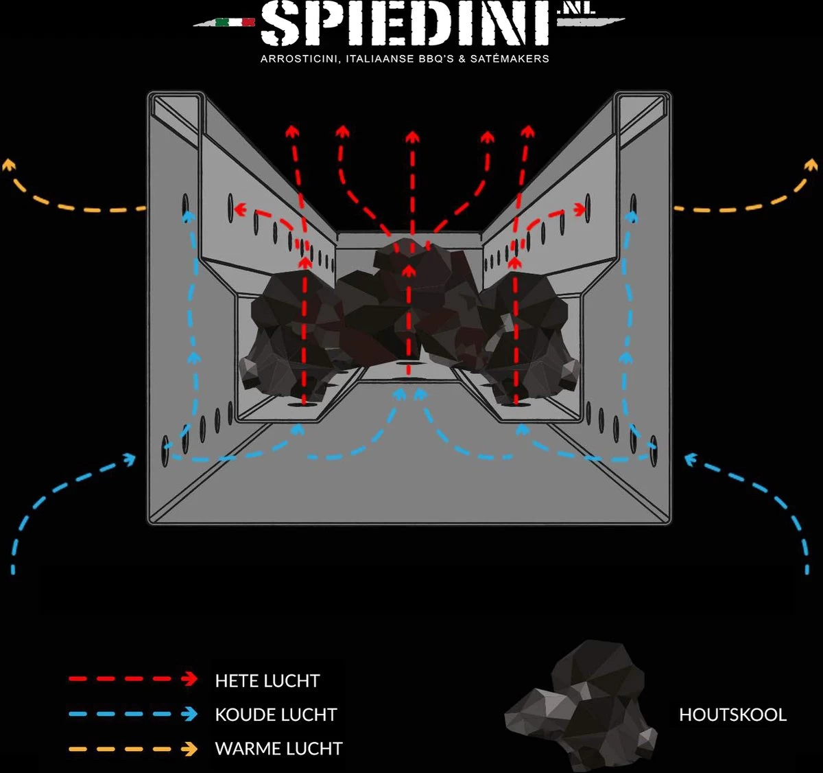 La largeur de ce BBQ est d’environ 80 centimètres, la profondeur du plateau du gril est d’environ 12 centimètres et il a une hauteur de travail d’environ 83 cm. Avec des pieds très solides. Ce BBQ saté est conçu et fabriqué avec amour dans la capitale des Abruzzes, Pescara. Spiedini est le distributeur exclusif de ce produit aux Pays-Bas ! Et maintenant, nous avons notre eigen modèle, en particulier pour le marché néerlandais – pour le satay.