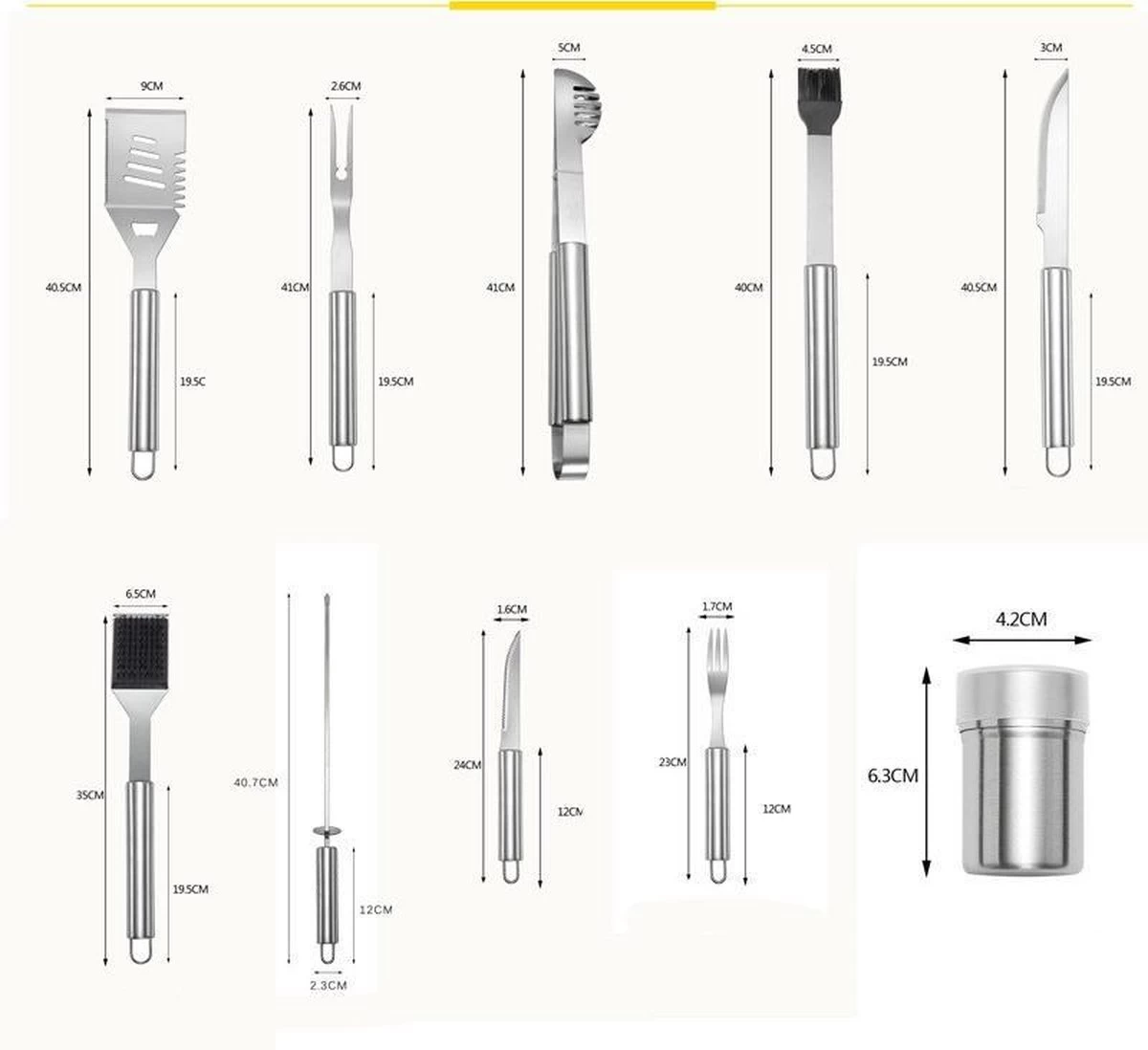 | Ensemble d'éléments de barbecue | Spatule,Pince,Fourchette à barbecue,Pique,Brosse de nettoyage,Pinceau,Raclette,Couteau à steak,Porte-épis de maïs |